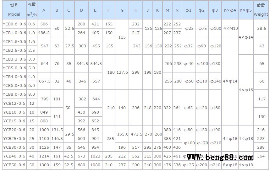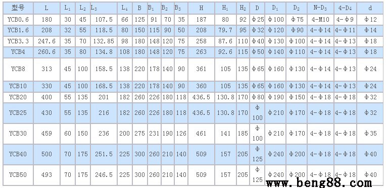 YCB型齒輪泵外形及安裝尺寸的性能參數(shù),是在介質(zhì)粘度4×10-3m2/s(40cSt)時確定的。YCB型齒輪泵外形及安裝尺寸性能參數(shù)表中給出的參數(shù)值適用于介質(zhì)粘度1×10-5~8×10-5m2/s(10~80cSt)范圍內(nèi),超出這個范圍則根據(jù)用戶提出的性能參數(shù)要求另行確定。