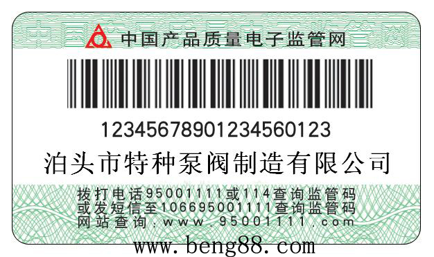 泊頭市特種泵閥制造有限公司自2008年5 月1 日出廠的產(chǎn)品,在產(chǎn)品合格證上粘貼長方形監(jiān)管碼標(biāo)簽,上有20位數(shù)字,這就是產(chǎn)品監(jiān)管碼。因此,我公司生產(chǎn)的每件產(chǎn)品都將有一個(gè)“電子身份證”。可以利用固定電話、手機(jī)短信、互聯(lián)網(wǎng)、超市終端等網(wǎng)絡(luò)通訊設(shè)備對電子監(jiān)管碼進(jìn)行查詢,辨別真?zhèn)?。查詢辦法如下: